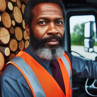 see a wonderful sight. I see a log truck coming to a stop. A Black man gets out
